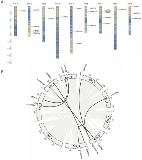 2.2. Chromosomal Distribution and Duplication Events among LsARF Genes