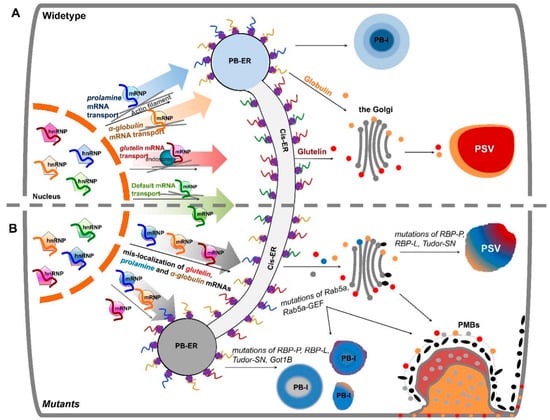A prominent role of intracellular localization of mRNAs is to target the distribution of the encoded protein and, thereby, generate a high concentration at specific locales []. Specific localization of prolamine mRNAs on the PB-ER results in intensive local translation to generate a high concentration of prolamine polypeptides within the ER lumen, an environment conducive for self-assembly of prolamine polypeptides to form intracisternal granules, which eventually develop into ER-derived mature PB-I [] (Figure 1A). Targeting of glutelin mRNAs to spatially separate cis-ER prevents the potential interaction of the newly synthesized glutelin with prolamine and α-globulin polypeptides in the ER lumen. This enables the proglutelin polypeptide to fold correctly and assemble into a quaternary structure competent for export from the ER lumen to the Golgi and subsequently to the PSVs.
