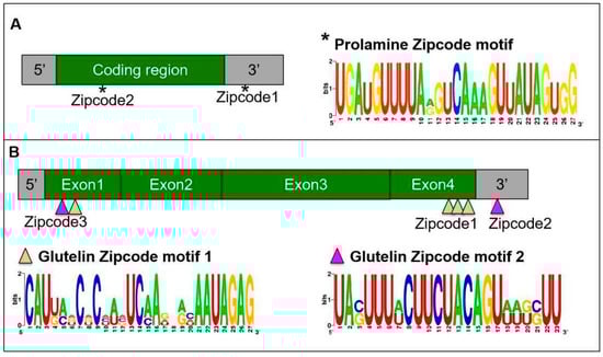 RNA zipcodes identified in prolamine (A) and glutelin (B) mRNAs (adapted from []). (A) The proximate locations (left) and the consensus motif sequence (right) of the two zipcode elements in prolamine mRNA. Prolamine zipcode elements are located in the coding region and 3′ UTR and consists of only a single zipcode motif (*). (B) The proximate locations (top) and the consensus motif sequences (bottom) of the zipcode elements in glutelin mRNA. Glutelin mRNAs possess three zipcodes (zipcode 1, 2, 3), which consist of two motifs, zipcode motif 1 (orange triangles) and zipcode motif 2 (magenta triangles). 5′ and 3′ denote 5′ UTR and 3′ UTR, respectively.