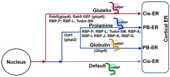 The hierarchal relationship among the three mRNA transport pathways in developing rice endosperm (adapted from []). The glutelin mRNA localization pathway to the cis-ER (red) is dominant over the pathway targeting prolamine/α-globulin mRNAs to the PB-ER (blue), which, in turn, is dominant over the default pathway (gray). Studies from mutant rice lines expressing defective Got1 (glup2), Rab5 (glup4) and Rab5-GEF (glup6), indicate that membrane trafficking mediates the mRNA transport to the PB-ER or cis-ER. Another rice mutant, glup5, possessing an undefined genetic defect, misdirects α-globulin mRNAs to the cis-ER without affecting the localization of prolamine mRNAs to the PB-ER. The key RBPs responsible for glutelin and prolamine mRNA localization, are marked under each pathway. The three RNA-transport pathways may share some common RBPs or factors for mRNA targeting to the cortical ER membrane, while additional specific factors are required for selective transport during each pathway.