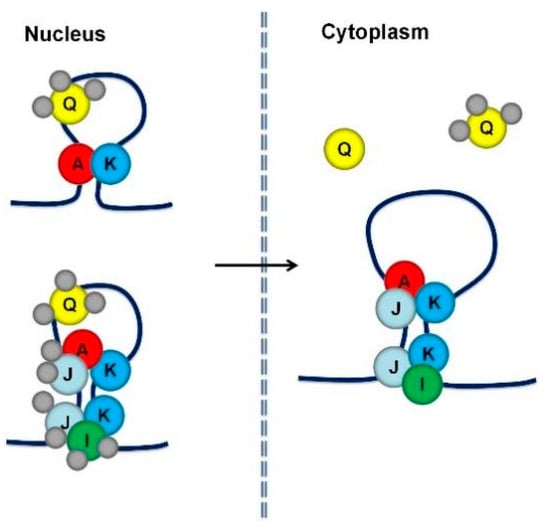 Following the identification of cis-acting elements in RNAs, identification of transacting factors, mainly RNA-binding proteins (RBPs), was pursued. Two strategies were used to identify the RBPs required for prolamine and glutelin mRNA localization, respectively. Affinity chromatography using prolamine zipcode RNA as bait to pull-down interacting RBPs was initially applied []. Fifteen unique RBPs with specific binding affinity to the prolamine zipcode were selectively captured under highly stringent washing and elution conditions. Five of these RBPs, A, I, J, K, and Q, were heterogeneous nuclear ribonucleoproteins (hnRNPs) containing two RNA recognition motifs (RRMs) and were selected for further functional analysis []. All five RBPs have binding capability to prolamine zipcode RNAs. They form multiple complexes in the nucleus and cytoplasm, suggesting that they mediate various steps during prolamine mRNA transport and localization (Figure 4 and Figure 5). RBPs A-J-K and I-J-K assemble into two complexes associated with prolamine zipcodes in both the nucleus and cytoplasm, while RBP-Q is involved in the formation of an undefined third complex in the nucleus that is released in the cytoplasm.