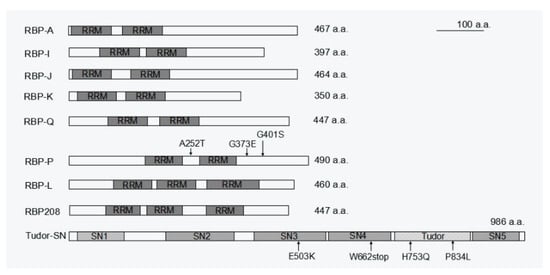 Schematic structure of the available RBPs responsible for prolamine and/or glutelin mRNA localization. While RBP-A, I, J, K, Q, and P contain two RRM motifs, there are three RRMs in RBP-L and RBP208. Tudor-SN consists of four SN-like domains (SN1 to 4) followed by a Tudor domain and a fifth abbreviated SN-like domain (SN5). The mutations sites in RBP-P and Tudor-SN that cause mislocalization of prolamine and glutelin mRNAs are indicated by arrows followed by labeling amino acid substitutions. a.a., amino acids.