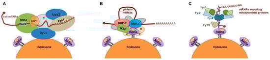 Long-distance endosomal transport of mRNAs is well studied in Ustilago maydis, a fungus that causes corn smut disease. A highly polarized growth of infectious hyphae is heavily dependent on motor-mediated endosomal transport along microtubules (Figure 6A) []. During the process, higher-order septin filaments are generated with gradients to set up polarized growth via endosomal transport of septin mRNAs, including cdc3, cdc10, cdc11, and cdc12. The endosomal transport of septin mRNAs requires their binding to the RNA binding protein Rrm4 [,,], which interacts with a membrane-associated linker protein Upa1 through its FYVE domain to link mRNPs on endosomes. Thus, the complex of Rrm4 and Upa1 work together with the other two RBPs, Pab1 and Upa2 [,] to co-mediate endosomal transport of cdc mRNAs (Figure 6A). Apparently, specific adaptor proteins are required to hitch mRNPs onto endosomes for active transport of mRNAs.
