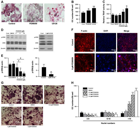 Inhibition of extracellular signal-regulated kinase (ERK) increased osteoclast (OC) differentiation in RAW 264.7 cells. Cells were treated with PD98059 and U0126 in the presence of 50 ng/mL receptor activator of NF-κB ligand (RANKL) for 4 days. (A,B) Effect of ERK inhibitors on the formation of tartrate-resistant acid phosphatase (TRAP)-positive multinucleated OCs (n = 4 independent experiments, each performed in triplicate). (C) Effect of PD98059 on TRAP activity of OCs (n = 3). (D,E) Effect of PD98059 and U0126 on ERK phosphorylation of RAW 264.7-derived OCs (n = 3). (F) Actin ring formation of OCs, which were stained by Alexa 555-phalloidin (F-actin) and DAPI (nuclei), respectively (n = 3). (G) Dose effect of PD98059 on OC differentiation (n = 3 independent experiments, each performed in triplicate). (H) Number of nuclei per OC (n = 3). Each result represents the mean ± SD. * p < 0.05, ** p < 0.01, and *** p < 0.001 vs. control (B,C,E,H) or dimethyl sulfoxide (DMSO) (E), and # p < 0.05 vs. 2 μM PD98059 (E).