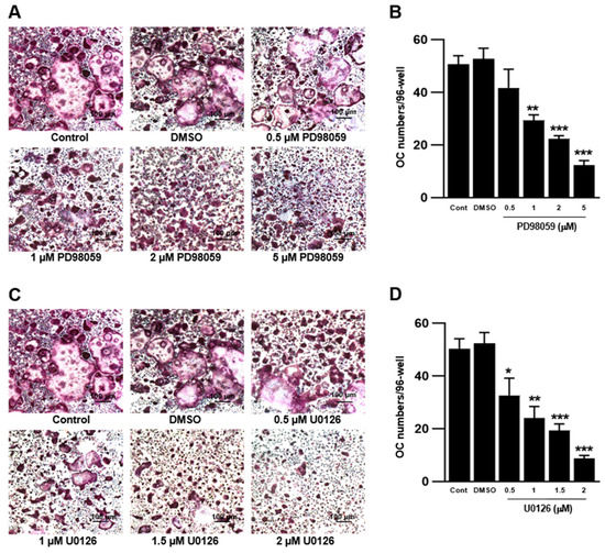 Inhibition of ERK decreased OC differentiation in bone marrow monocytes (BMMs). Cells were cultured with 30 ng/mL macrophage colony-stimulating factor (M-CSF) for 3 days and then treated with PD98059 and U0126 in the presence of 30 ng/mL M-CSF and 50 ng/mL RANKL for 4 days. (A,B) Effect of PD98059 on OC differentiation from BMMs (n = 3 independent experiments, each performed in triplicate). (C,D) Effect of U0126 on OC differentiation from BMMs (n = 3 independent experiments, each performed in triplicate). Each result represents the mean ± SD. * p < 0.05, ** p < 0.01, and *** p < 0.001 vs. DMSO.