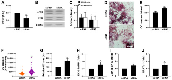 To demonstrate the negative role of ERK in RAW 264.7-derived OCs, we knocked down ERK in RAW 264.7 cells using ERK2 siRNA and differentiated the cells into OCs. Both ERK1 and ERK2 play essential roles in supporting osteoclastogenesis. In this study, we focused on the effects of ERK2 on molecular signaling mechanisms activated by RANKL because of following reasons: First, ERK2 is expressed more dominantly than ERK1 in most mammalian tissues [43,44]. Secondly, ERK2 has been relatively less thoroughly studied compared to ERK1 in OCs [18]. ERK expression was reduced in ERK2 siRNA-transfected cells compared to that in scRNA-transfected cells (Figure 3A–C). However, the number of OCs in the ERK2 siRNA-transfected group was higher than that in scRNA-transfected cells (Figure 3D,E). The OCs derived from ERK2 siRNA-transfected cells were significantly larger than those derived from scRNA-transfected cells (Figure 3F,G). Moreover, ERK2 siRNA transfection markedly increased the expression of OC markers, including dendritic cell-specific transmembrane protein (DC-STAMP) and cathepsin K, and the master transcription factor of OC, NFATc1 (Figure 3H–J). These results strongly suggest that ERK negatively regulates RANKL-induced OC differentiation in RAW 264.7 cells.