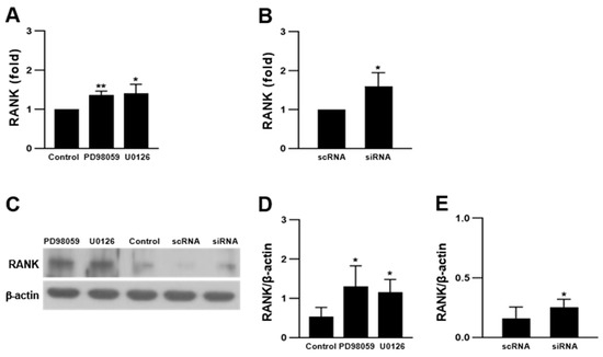 Inhibition of ERK increased expression of RANK. RAW 264.7 cells were treated with 5 μM PD98059 and 2 μM U0126, or were transfected with ERK2 siRNA, and differentiated into OCs in the presence of 50 ng/mL RANKL for 4 days. (A,B) Quantitative analyses of mRNA expression by ERK inhibitors and ERK2 siRNA (n = 3). (C–E) Protein expression of RANK in ERK inhibitor-treated and ERK2 siRNA-transfected cells (n = 3). Each result represents the mean ± SD. * p < 0.05 and ** p < 0.01 vs. control or scRNA.