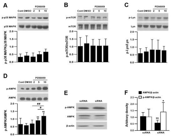 Inhibition of ERK increased adenosine 5′-monophosphate-activated protein kinase (AMPK) phosphorylation. Cell lysates were prepared from PD98059-treated OCs and ERK2 siRNA-transfected OCs, and activation of kinases was measured by Western blotting. Phosphorylation of p38 MAPK (n = 4) (A), mTOR (n = 3) (B), Lyn (n = 3) (C), and AMPK (n = 6) (D). (E,F) AMPK phosphorylation was determined in OCs of ERK2 siRNA-transfected cells (n = 5). Each result represents the mean ± SD. * p < 0.05 and ** p < 0.01 vs. control or scRNA, and # p < 0.05 and ## p < 0.01.