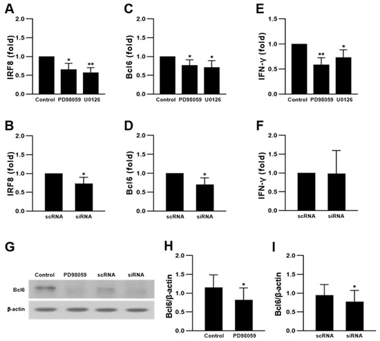 Inhibition of ERK suppressed the expression of inhibitory mediators of OC differentiation. RAW 264.7 cells treated with 5 μM PD98059 and 2 μM U0126 or transfected with ERK2 siRNA, and differentiated into OCs in the presence of 50 ng/mL RANKL for 4 days. Quantitative analyses of mRNA expression of IRF8 (A,B), Bcl6 (C,D), and IFN-γ (E,F) (n = 3). (G–I) Protein expression of Bcl6 in PD98059-treated and ERK2 siRNA-transfected cells (n = 3). Each result represents the mean ± SD. * p < 0.05 and ** p < 0.01 vs. control or scRNA.