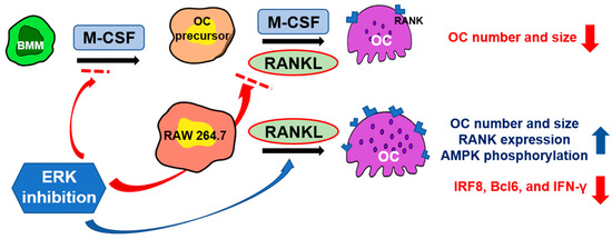 In the present study, inhibition of ERK increased OC differentiation in RAW 264.7 cells but decreased it in BMMs. This suggests multiple roles of ERK in osteoclastogenesis. In the early period of our culture system with BMMs, ERK signals play a positive role in osteoclastogenesis, as many other researchers have previously demonstrated. In contrast, our results clearly indicate that ERK signaling shows suppressive roles in RANKL-induced RAW 264.7 cell OC differentiation. This suppressive effect of ERK on RAW 264.7 cell OC differentiation is possibly due to the antiproliferative activity of RANKL. Furthermore, ERK inhibited AMPK activation and RANK expression in RAW 264.7-derived OCs and stimulated the expression of negative mediators of OC differentiation, such as IRF8, Bcl6, and IFN-γ (Figure 7). Thus, we propose that ERK signaling may be a target for the treatment of diseases that show abnormal bone resorption, such as osteoporosis, rheumatoid arthritis, and osteopetrosis. However, precaution should be taken when ERK signaling is targeted for drug development to treat OC-related diseases.