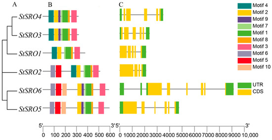 Phylogenetic relationship, conserved motifs and gene structure of StSRO genes. (A) Phylogenetic relationship of StSRO genes, (B) the ten conserved motifs of StSRO genes are displayed in different colors, (C) the exon-intron structure. The coding sequence (CDS) and untranslated region (UTR) are displayed in different colors, and the lines between the boxes represent introns.