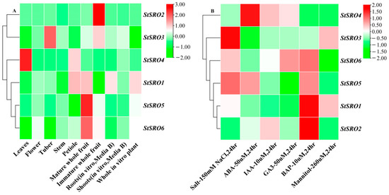 The analysis of tissue-specific gene expression patterns can provide clues for the possible function of genes in development [36,37]. Therefore, the DM potato RNA sequencing data published on the online database were downloaded to analyze the changes in StSRO gene expression in different tissues and stresses. The results showed that (Figure 11A) the expression of StSRO1 was higher in the petiole, mature whole fruit, roots and whole in vitro plant, while the expression was lower or absent in other tissues. The expression of StSRO2 was only present in immature whole fruit of potato but not in other tissues. StSRO3 was highly expressed in tubers and immature whole fruits, but its expression level was low in other tissues. The expression of StSRO4 was higher in leaves and petiole but lower in other tissues. The expression patterns of StSRO5 and StSRO6 were similar, both being expressed only in the mature whole fruit, and the expression level was low or absent in other tissues. All StSROs expressed in flowers, stems and shoots were at a low level. Thus, most StSRO genes play a vital role in the growth and development of potatoes, and StSRO genes were highly expressed in petiole and immature fruit. Therefore, StSRO genes may have indispensable biological functions in potato petiole and immature whole fruit.