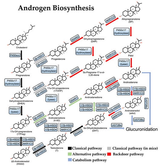 - Auchus, R.J. The backdoor pathway to dihydrotestosterone. Trends Endocrinol. Metab. 2004, 15, 432–438. [Google Scholar] [CrossRef]