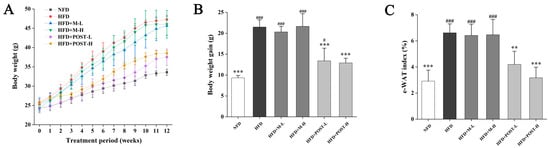 The Experimental Animal Ethics Committee of Jiangnan University approved this study (qualified number: JN. No 20210330c1250715(056)). Male C57BL/6N mice were acquired from Vital River Co., Ltd. (Beijing, China). The mice were acclimated for 1 week in an SPF-rated facility with unrestricted access to water and food. Thirty mice were randomly divided into 6 groups, with 5 mice in each group. Mice in each group were fed either a normal-fat diet (NFD, TP23302, TROPHIC, Nantong, China) or a high-fat diet (HFD, TP23300, TROPHIC, Nantong, China). The detailed grouping was as follows: (1) NFD: an NFD was provided to mice; (2) HFD: an HFD was provided to mice; (3,4) HFD + M-L, HFD + M-H: mice were fed an HFD, and there was M intervention (M-L: 200 mg/kg/day, M-H: 800 mg/kg/day); (5,6) HFD + POST-L, HFD + POST-H: mice were fed an HFD, and there was POST intervention (POST-L: 200 mg/kg/day, POST-H: 800 mg/kg/day). POST and M were administered to mice by gavage at the appropriate doses dissolved in 0.2 mL of saline once daily for 12 weeks, and the NFD and HFD groups were given the same amount of normal saline. The mice were weighed weekly during the experiment. Blood was drawn from the eyes, while the serum was obtained by centrifugation after standing and was stored at -80 °C. The epididymal white fat (e-WAT) was weighed after dissection.