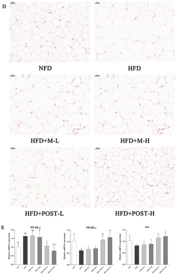 To investigate whether POST prevents HFD-induced obesity, it was administered to HFD mice for 12 weeks. After ingesting the HFD, the mice had markedly increased body weight, and significant epididymal white fat accumulation (e-WAT), whereas the POST intervention significantly suppressed body weight gain (HFD + POST-L vs. HFD: decreased 0.38-fold, p < 0.001; HFD + POST-H vs. HFD: decreased 0.40-fold, p < 0.001) and e-WAT accumulation (HFD + POST-L vs. HFD: decreased 0.37-fold, p < 0.01; HFD + POST-H vs. HFD: decreased 0.52-fold, p < 0.001) in HFD mice, while the diameter of e-WAT in POST intervention groups was substantially smaller than that in HFD group (Figure 1A–D). However, the M intervention failed to improve HFD-induced weight gain and e-WAT accumulation (Figure 1A–D). The expression of lipid metabolism genes in e-WAT was further investigated (Figure 1E). HFD significantly promoted the expression of peroxisome proliferator-activated receptor gamma (PPAR-γ) but significantly inhibited the expression of peroxisome proliferator-activated receptor alpha (PPAR-α). However, after POST intervention, the mRNA expression of PPAR-γ (HFD + POST-L vs. HFD: decreased 0.35-fold, p = 0.0172; HFD + POST-H vs. HFD: decreased 0.52-fold, p < 0.001) was significantly decreased, the mRNA expression of PPAR-α (HFD + POST-L vs. HFD: increased 0.74-fold, p = 0.0081; HFD + POST-H vs. HFD: increased 0.92-fold, p < 0.001) and hormone-sensitive lipase (HSL) (HFD + POST-L vs. HFD: increased 0.41-fold, p = 0.0482; HFD + POST-H vs. HFD: increased 0.49-fold, p = 0.0119) was significantly increased.