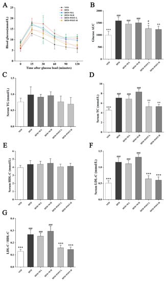POST improves IR and serum lipid parameters in HFD mice. (A) OGTT showed changes in blood glucose at different time points after oral glucose. (B) The AUC according to the OGTT curve. (C–F) Concentrations of serum lipids indices, namely TG, TC, LDL-C and HDL-C. (G) LDL-C/HDL-C value. Compared to HFD, * p < 0.05, ** p < 0.01, and *** p < 0.001; Compared to NFD, # p < 0.05, and ### p < 0.001.