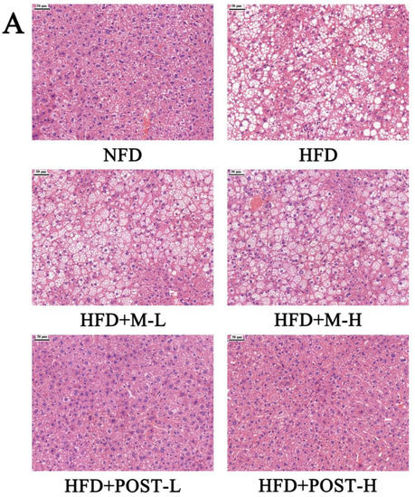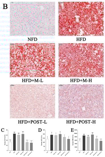 In the assessment of NAFLD, H&E and/or Oil Red O staining analysis, which is evaluated by section morphology, is often used. The H&E staining results showed that the liver tissue sections of NFD mice had regular morphology, while the liver tissue sections of HFD mice were filled with a large number of fat vacuoles with severe steatosis (Figure 3A). The results of Oil Red O staining also showed the same trend as H&E staining, with a greater accumulation of lipid droplets in the liver tissue of HFD mice compared to that in NFD mice (Figure 3B). Hepatic steatosis was suppressed in the POST intervention group (Figure 3A,B). Qualitative histopathological analysis of liver sections revealed that mice exhibited significant hepatic steatosis (grade 7) and inflammation (grade 1) after HFD ingestion, while the liver steatosis (HFD + POST-L: grade 1, HFD + POST-H: grade 0) and inflammation (HFD + POST-L: grade 0, HFD + POST-H: grade 0) were significantly ameliorated after the POST intervention (Table 1). Hepatic steatosis is often accompanied by hepatic impairment, and serum liver enzyme levels are sensitive indicators of liver injury. Changes in the levels of liver enzymes (AST, ALT, and CHE) in the serum were evaluated in all groups of mice after the histological observation of liver damage, and the results revealed that the HFD produced a considerable increase in serum liver enzyme levels (Figure 3C–E). Compared with HFD mice, the HFD + POST decreased the serum liver enzyme activities in a dose-dependent manner, namely ALT (HFD + POST-L vs. HFD: decreased 0.51-fold, p < 0.001; HFD + POST-H vs. HFD: decreased 0.54-fold, p < 0.001), AST (HFD + POST-L vs. HFD: decreased 0.15-fold, p > 0.05; HFD + POST-H vs. HFD: decreased 0.26-fold, p = 0.0414), and CHE (HFD + POST-L vs. HFD: decreased 0.21-fold, p = 0.0043; HFD + POST-H vs. HFD: decreased 0.36-fold, p < 0.001) (Figure 3C–E). However, the M treatment failed to ameliorate hepatic steatosis and liver injury in HFD mice (Figure 3A–E).