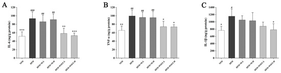 POST reduces hepatic inflammation in HFD mice. The concentration of cytokines in the liver, (A) IL-6, (B) TNF-α, (C) IL-1β. Compared to HFD, * p < 0.05, ** p < 0.01, and *** p < 0.001; Compared to NFD, # p < 0.05, ## p < 0.01, and ### p < 0.001.