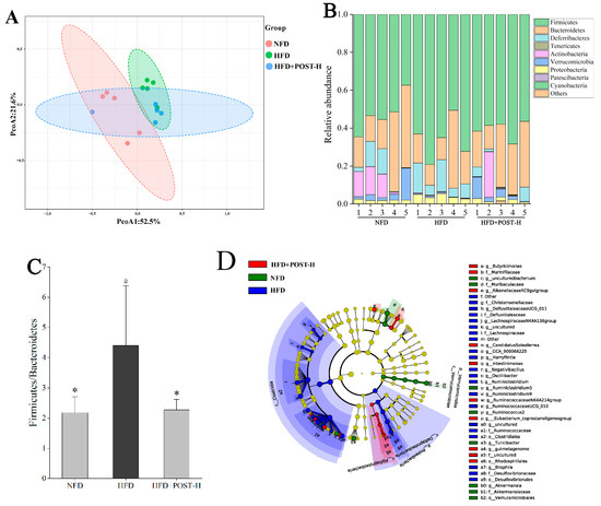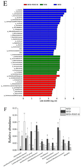 POST regulates gut microbiota. (A) PCoA analysis (PCoA1 = 52.5%, PCoA2 = 21.6%). (B) phylum-level microbial relative abundance (C) The value of F/B. (D) Cladograms for LEfSe analysis. (E) LDA scores. (F) The top 10 differential genera in relative abundance. Compared to HFD, * p < 0.05, and ** p < 0.01; Compared to NFD, # p < 0.05, and ## p < 0.01.