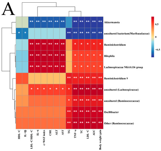 Spearman analysis was used to determine the associations between different genera in terms of high abundances and NAFLD symptoms (Figure 6A). Lachnospiraceae NK4A136 group, Ruminiclostridium, and Bilophila had significantly negative correlations with all lipid metabolism parameters except TG, HDL-C, and IL-1β. Ruminiclostridium 9, uncultured (Ruminococcaceae), Oscillibacter, and Other (Ruminococcaceae) had significantly positive correlations with weight gain, AUC, TNF-α, and serum lipid indices other than HDL-C. Uncultured (Lachnospiraceae) had a significantly positive correlation with all indices except HDL-C and IL-1β, but Akkermansia and uncultured (Lachnospiraceae) were completely opposite. Uncultured bacterium (Muribaculaceae) was negatively associated with blood lipids, AUC, weight gain, and the IL-1β and TNF-α indices.