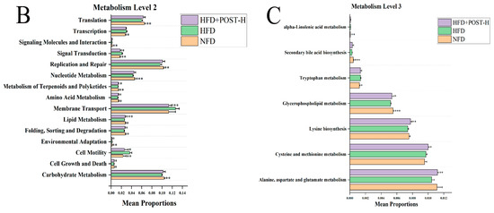 The gut microbiota metabolism of mice was predicted by PICRUSt2. Compared with the HFD group, lipid metabolism, amino acid metabolism and other metabolic pathways were significantly enriched in HFD + POST-H and NFD groups, indicating that POST supplementation can partially reverse the gut microbiota function of HFD mice (Figure 6B). We further studied the tertiary KEGG pathway of lipid metabolism and amino acid metabolism (Figure 6C), and the results showed that POST-H supplementation significantly promoted the relevant metabolic pathways in HFD mice, including alanine, aspartate and glutamate metabolism, cysteine and methionine metabolism, lysine biosynthesis and glycerophospholipid metabolism.