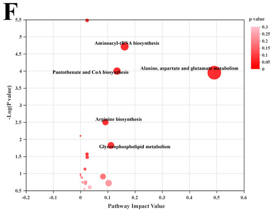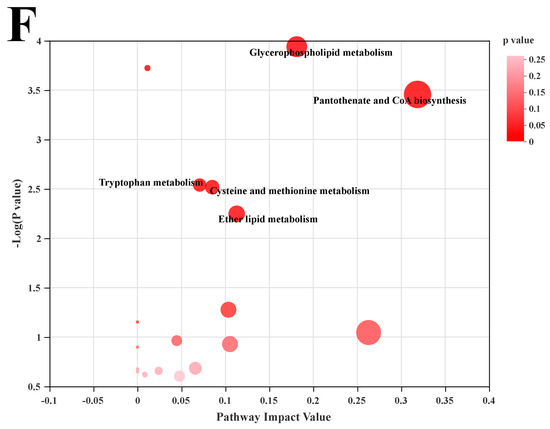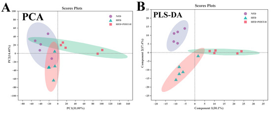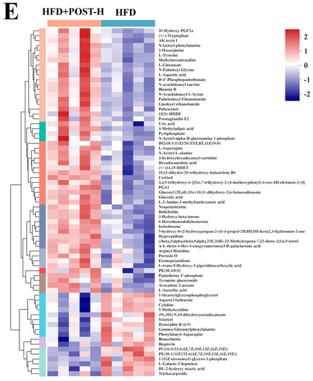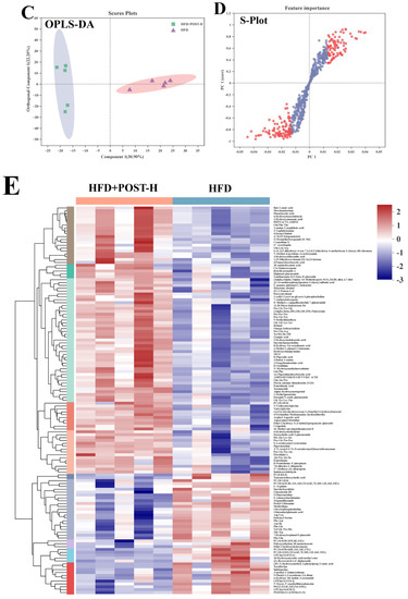 We used LC-MS metabolomic analysis to detect the metabolic profile of the mouse liver and further explored the mechanism of action of POST. Based on the PCA and PLS-DA analysis results, the hepatic metabolites in the NFD, HFD, and HFD + POST-H groups were clearly differentiated, and the POST-H intervention partially reversed the metabolite changes caused by HFD (Figure 7A,B and Figure 8A,B). The score plot of the OPLS-DA model illustrated a clear separation between the HFD and HFD + POST-H groups (Figure 7C and Figure 8C). The metabolites far from the center in the loading graph were liver metabolites (potential biomarkers) that were markedly altered after the HFD + POST-H intervention (Figure 7D and Figure 8D). In this study, potential biomarker metabolites were screened based on the VIP value (>1.0) and p-value (<0.05), which explain the differences between the HFD + POST-H and HFD groups. In the liver, 206 potential biomarkers were identified in the 2 ion modes. After the POST-H intervention in HFD mice, the contents of 93 metabolites significantly increased, 42 metabolites significantly decreased in the positive ion mode, 54 metabolites increased markedly, and 17 metabolites decreased markedly in the negative ion mode (Figure 7E and Figure 8E). We performed a KEGG analysis of the metabolic pathways of hepatic differential metabolites to gain insight into the effects of POST-H on HFD mice. The metabolic pathways significantly affected by POST-H were selected according to their impact value (>0.05) and p-value (<0.05). The results showed that POST-H significantly regulated glycerophospholipid metabolism, pantothenate and CoA biosynthesis, cysteine and methionine metabolism, tryptophan metabolism, alanine, aspartate, and glutamate metabolism, ether lipid metabolism, aminoacyl-tRNA biosynthesis, and arginine biosynthesis (Figure 7F and Figure 8F).