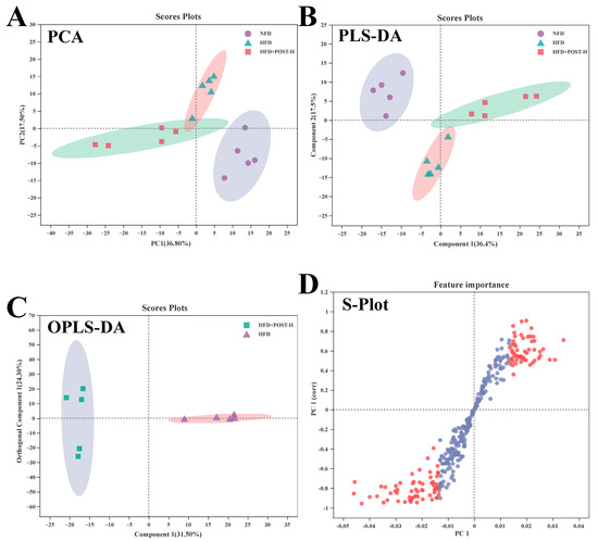 POST regulates hepatic metabolism (ESI+). (A) PCA score of the NFD, HFD and HFD + POST-H. (B) PLS-DA score of the NFD, HFD and HFD + POST-H. (C) OPLS-DA score of the HFD and HFD + POST-H. (D) S-loading plot based on OPLS-DA analysis of the HFD and HFD + POST-H. The red points indicate that these metabolites have a VIP value of 1 or greater, and the blue points indicate that these metabolites have a VIP value of less than 1. (E) Heat map of relative abundance of differential metabolites in liver between HFD and HFD + POST-H. (F) The effects of POST-H on liver metabolic pathways were analyzed based on KEGG.