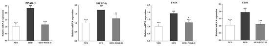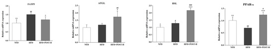 POST regulates hepatic lipid metabolism. Relative mRNA expression of PPAR-γ, SREBP-1c, FASN, CD36, FATP5, ATGL, HSL, and PPAR-α in the liver. Compared to HFD, * p < 0.05, ** p < 0.01, and *** p < 0.001; Compared to NFD, # p < 0.05, ## p < 0.01, and ### p < 0.001.