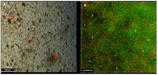 (A)—Young, 12 h staphylococcal ATCC 6538 biofilm grown in a microplate (24-well) seen in an optical microscope (aerial perspective) without any prior preparative procedures; red arrows indicate areas of higher cellular density (mushroom-like structures); (B)—aerial perspective of L/D-dyed, 24 h biofilm of the same strain. The “1s” show areas non-covered with cells (holes); the 2s” show areas of lower cellular density (of lower intensity of green color) than areas designated with “3s” (of higher density of green color). Red shapes are cells of decreased viability (with a compromised cell wall) or dead; while green shapes are viable cells (of non-compromised cell wall). Picture (A), inverted microscope DMIL LED, magnification 10×; Picture (B), confocal microscope SP8, magnification 40×.