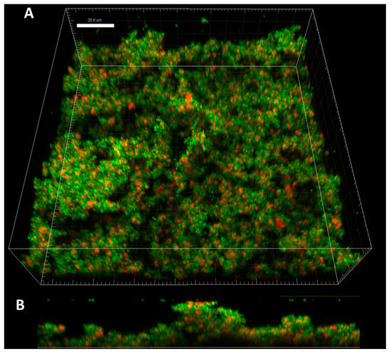 The application of confocal microscopy provided a more detailed insight into the distribution of staphylococcal cells (and their state) within the Z-axis (thickness) of biofilm structure. The staphylococcal biofilms, such as the one presented in Figure 2, were of hill-like shape and contained regions of different thickness and of different cells’ density, including areas non-covered with cells (“holes”).