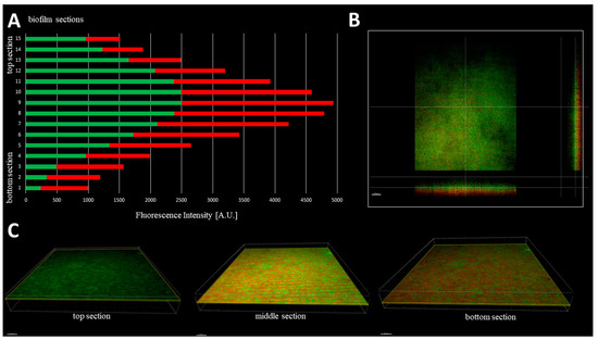 Typical distribution of cellular density through the biofilm (ATCC 6538 strain) from its top to the bottom section (A,B) and the growing share of dead/cell wall compromised cells in the deeper parts of biofilm (A,C). Thickness of every section was 2.16µm. Red and green color in (A) represents Fluorescence Intensity of propidium iodide or SYTO-9, respectively; microscope SP8, magnification 40×. Scale bar is 50 µm.