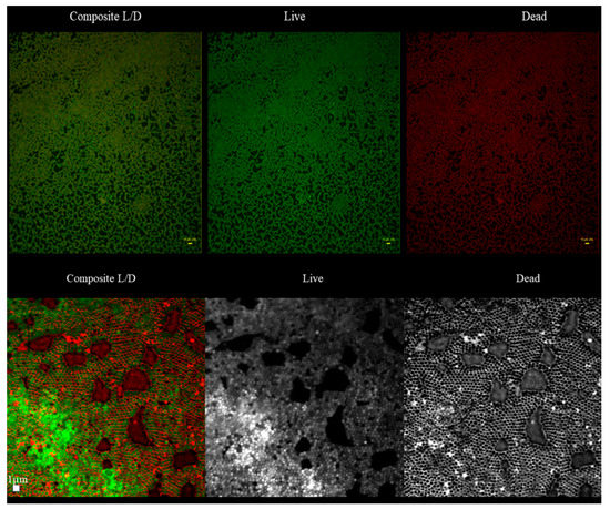 With regard to the ratio of altered (damaged) to non-altered (non-damaged) cells within particular parts (B,M,T) of 10 staphylococcal biofilms, the three various patterns were distinguished (Figure S1). In 50% of cases, the majority of altered cells were located in the B part of the biofilms, while the majority of non-altered cells in their T part. In case of the second pattern, present in 30% of staphylococcal biofilms, the majority of altered cells were also localized in the B part of the biofilm, while the M and T parts consisted of the altered and non-altered cells in various proportions. In the case of the third pattern, present in 20% of staphylococcal biofilms, the majority of the non-altered cells were localized in the M part of the biofilm, while the remaining parts (T, B) of this structure consisted mostly of altered (damaged) cells (Table S2). These types of different cell distributions could also occur simultaneously within a single culture plate well (Figure S2). Next, the areas described in this manuscript as “the holes” (black, non-fluorescent areas pointed as “1s” in Figure 1B) were scrutinized. As already shown, the standard in vitro culture of staphylococci led to the formation of a biofilm of almost full confluency (average above 90%, Table S1). The lowest confluency (81.7%) among the tested strains was displayed by the S1 strain. For the biofilm of this strain, an analysis aiming to evaluate the character of the black, non-fluorescent areas was performed using L/D dyeing (Figure 4).