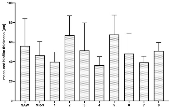 Measured thickness of staphylococcal biofilms (n = 10) in vitro.