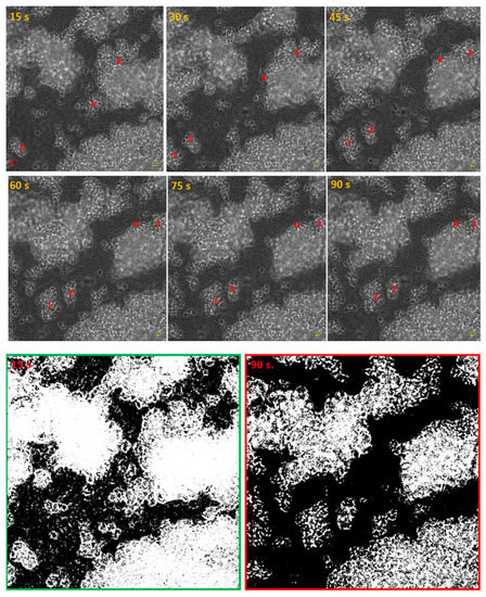 The introduction and removal of liquids (rinsing, antiseptic introduction, dyeing) to and from the culture vessels, where biofilms are cultured, belong to the recognized disadvantages of microplate-based methods, as they lead to random de-attachment of biofilm. Figure 6 presents the impact of a single step (medium removal) on the spatial distribution of the staphylococcal biofilm during 90 s of observation. The processing of the initial (15 s) and the final image frame (90 s) with the use of imageJ software indicated (Figure 6, lower panel) that areas covered with cellular structures differed by 23.027%.
