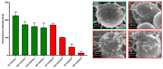 The procedures were performed as in Section 4.2 and Section 4.3 with such a difference that rinsing with water was performed one, two, three or four times. After every rinsing, analysis with use of Etaluma Lumascope 620 fluorescent microscope (San Diego, CA, USA), as performed in Section 4.3, was performed to capture the changes in Fluorescence Intensity from SYTO-9 and propidium iodine dyes.