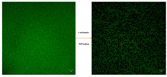 Staphylococcal biofilm of the ATCC 6538 strain non-treated (left picture) and treated (right picture) with an antiseptic (PVP-iodine). Biofilms dyed with SYTO-9 only. Aerial perspective, epifluorescent microscopy. Data collected with wide-field Lumascope 620 magnification 20×, scale bar is 10 µm.