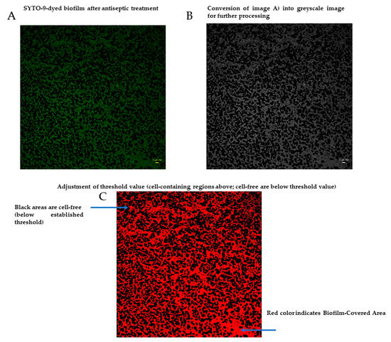 Processing of biofilm image to extract the value of Biofilm-Covered Area [%]. (A)–biofilm after treatment with antiseptic; (B,C)—processing stages aiming to extract the value of BCA [%]. Data collected with wide-field Lumascope 620, 20×, scale bare is 10 µm.