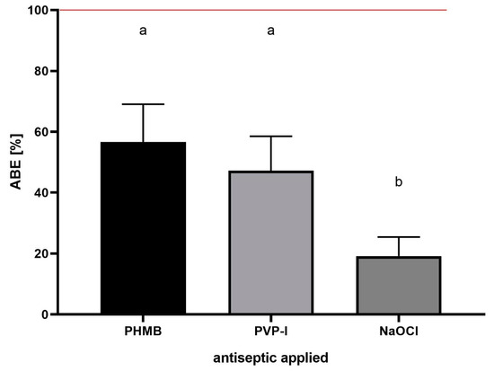 ABE [%] value recorded for polyhexamethylene (PHMB), povidone–iodine (PVP-I) and hypochlorite solution (NaOCl) towards staphylococcal biofilms (n = 10) formed in vitro. ABE [%]—Antiseptic’s Biofilm Eradication. Letters a,b show statistically significant differences in ABE [%] values between PHMB and PVP-I vs. NaOCl. The red line represents the level of formation of non-treated, control biofilm in relation to which the loss of biofilm-covered area and fluorescence intensity in treated biofilms are calculated.
