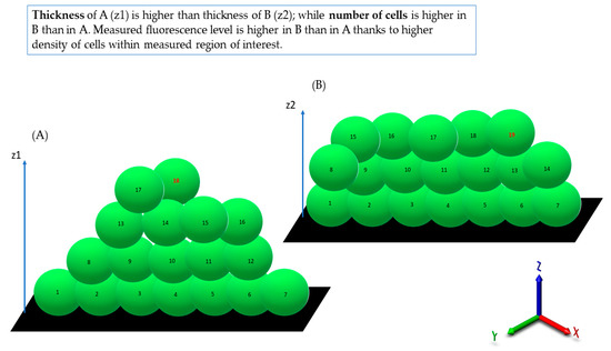 An attempt to explain the data presented in Table 1. Because of various cellular density between (A) and (B) parts of biofilm, the level of fluorescence of biofilm (B) is higher than that of biofilm (A), although biofilm (A) is thicker (4 “layers”) than biofilm (B), which consists of 3 “layers”. z1, z2—Z-axis showing biofilm thickness; green oval shapes—SYTO-9-dyed staphylococci emitting fluorescence; numbers in the central points of oval shapes show a higher number of cells in biofilm (A) in comparison to biofilm (B).