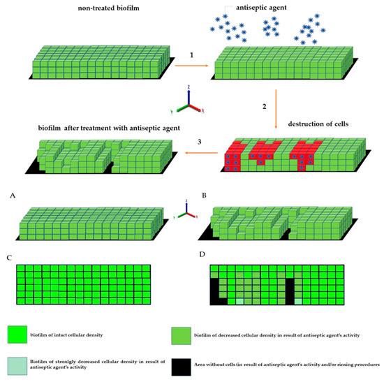 Schematic presentation of the phenomena occurring during antiseptic activity against biofilm reflected in the formation of “holes” and in a drop in fluorescence intensity. For picture clarity sake, the staphylococcal cells are shown as cubes, while intact biofilm formed by the cells is presented as an even (with regard to height) structure. (1)—introduction of antiseptic agent to biofilm; (2) antiseptic agent activity; (3) destruction of cells (resulting from antiseptic agent activity) and removal of cells (resulting from antiseptic agent activity and rinsing). (A,C)—intact biofilm in 3D and -xy plane, respectively; (B,D)—biofilm after the application of antiseptic in 3D and -xy plane, respectively.
