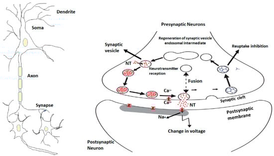 miRNAs are assumed to be a key players in the neuronal synaptic signaling [86,87]. The neurotransmitters such as glutamate, GABA, dopamine, and serotonin, are integrated into the presynaptic neurons, bundled into vesicles, and delivered into the post-synaptic neurons at synaptic cleft. This transportation of neuronal neurotransmitter is done by the encoded receptors present at the post synaptic neurons, encoded by mRNAs which are miRNA targets [88]. miR-153 regulates the synaptosomal-associated protein-25, (SNAP-25) [89] that mediates the calcium-initiated vesicle in combination with plasma layer and arrival of neurotransmitters in synaptic cleft [90]. Moreover, in model animal studies it was revealed that the overexpression of miR-153 represses the synaptic vesicle cycle at neuromuscular intersection whereas control expression results in antagonistic manner in the zebrafish. Furthermore, miR-153 also regulates the movement of zebrafish at undeveloped embryo stage which is probably the results of releasing the acetylcholine at neuromuscular intersections [90,91]. In another model animal study, it has been observed that miR-135a is directly involved in the regulation of early stress response. In the knockdown (KD) mouse study it was reported that miR-135a in amygdala induces an increase in anxiety-like behavior which was confirmed through spontaneous excitatory postsynaptic currents. Moreover, miR-135a also targets complexin-1 and complexin-2 (eukaryotic cytoplasmic neuronal proteins) which are significant for presynaptic vesicle combination [92].