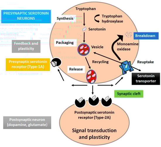 Serotonin (5-hydroxytryptamine) is a monoamine neurotransmitter involved in many brain functions modulating mood, and in different physiological processes [61]. Serotonin is produced in specialized neurons mostly in raphe nuclei and in major subdivision in the CNS [62,63]. To synthesize serotonin, the amino acid tryptophan is converted into 5HTP, and the 5HTP is converted into 5HT. There are seven different serotonin receptors (5-HT1, 5-HT2, 5-HT3, 5-HT4, 5-HT5, 5-HT6, and 5-HT7), which include six belonging to GPCRs and one associated with ligand-gated ion channels receptors [64,65]. Functional study showed that serotonin is associated with the pathophysiological depression and low concentration of serotonin in CSF may originate suicidal thoughts in patients. Therefore, many antidepressants are used to rise the levels of serotonin [66,67] (Figure 4).
