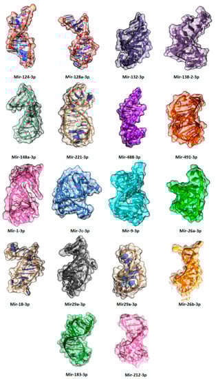 The predicted three-dimensional (3D) structures of miRNAs involved in anxiety and depression.