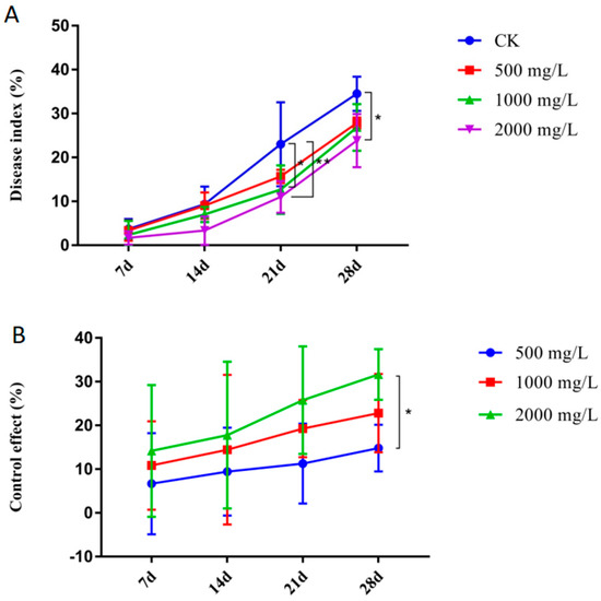 Sugarcane plants planted for 28 days in the field were inoculated with Xa, then treated with synergistic bactericide (1000 mg/L Cu(OH)2 + 0.05% silicon) at 7 and 14 d after inoculation. Three independent experiments were repeated in the year 2021. At 28 d after inoculation, the sugarcane leaf scald disease index was significantly higher in the control group than the treatment group (Figure 5); the disease index peaked at 51.3% in the control group at 28 d, which was 102.0% higher than in the treatment group (Figure 6A). The 7 dpt + 14 dpt treatment improved control of sugarcane leaf scald disease at 14, 21, and 28 d. The control efficacy stabilized by days 21 and 28, at which points the efficacy was significantly higher than it was at day 14. The control efficacy reached 50.3% at day 28, which was 9.8 times higher than it was at day 7 (Figure 6B).