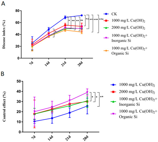 Disease index values (A) and control effects (B) in sugarcane with leaf scald disease at 7, 14, 21, and 28 d after inoculation with Xa. Plants were treated with one of two Cu(OH)2 concentrations and 0.05% inorganic or organic silicon. Data are presented as the mean ± standard error (n = 3). * indicated significance with p ≤ 0.05 (ANOVA and Tukey’s HSD), ** indicated significance with p ≤ 0.01 (ANOVA and Tukey’s HSD) and *** indicated significance with p ≤ 0.005 (ANOVA and Tukey’s HSD).