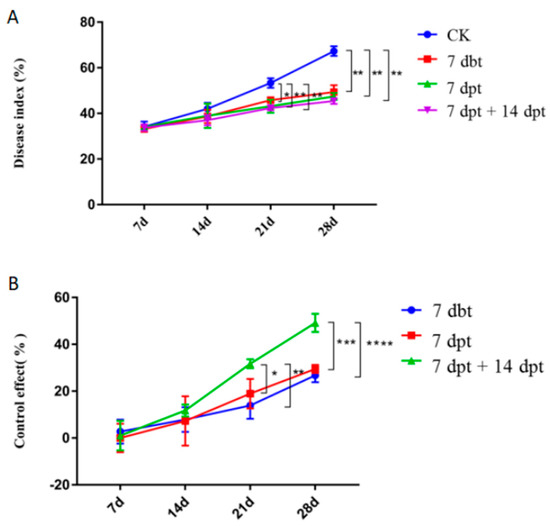 Disease index values (A) and control effects (B) in sugarcane with leaf scald disease at 7, 14, 21, and 28 d after Xa inoculation. Plants were treated with a synergistic bactericide at different time points before or after inoculation with Xa. dbt, days before treatment; dpt, days post-treatment. Data are presented as the mean ± standard error (n = 3). * indicated significance with p ≤ 0.05 (ANOVA and Tukey’s HSD), ** indicated significance with p ≤ 0.01 (ANOVA and Tukey’s HSD), *** indicated significance with p ≤ 0.005 (ANOVA and Tukey’s HSD) and **** indicated significance with p ≤ 0.001 (ANOVA and Tukey’s HSD).