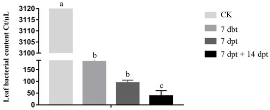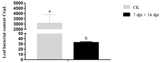 Bacterial content was quantified in plants after disease index values were calculated. The control plants measured 3079.9 Ct/μL at 28 d after Xa inoculation, which was 93.6 times higher than in the 7 dpt + 14 dpt treatment group (Figure 7). In summary, bacterial content was significantly different in the control group than in the treated groups. Furthermore, the reduction in bacterial content was more significant in the field experiment compared with the growth chamber experiments.