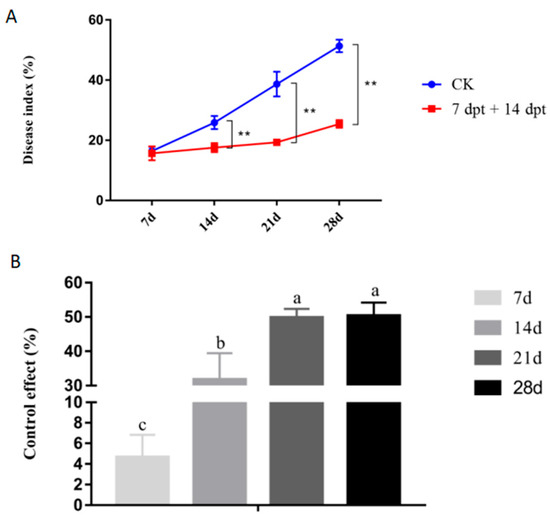 Disease index values (A) and bactericide control effects (B) in sugarcane with leaf scald disease. After treatment with synergistic bactericide at 7 and 14 d after inoculation with Xa. dpt, days post-treatment. Data are presented as the mean ± standard error (n = 3). Lowercase letters above bars indicate statistically significant differences between treatments (p ≤ 0.05, ANOVA, and Tukey’s HSD) and ** indicated significance with p ≤ 0.01 (ANOVA and Tukey’s HSD).