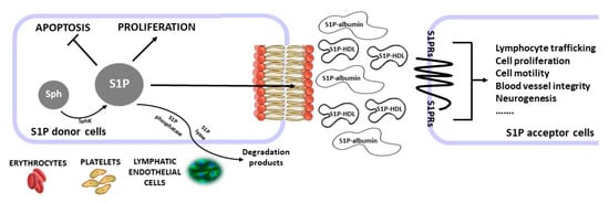 Currently, the emerging biological understanding, both on humans and on animal models, is under evaluation in order to assess how to target the SphK1/S1P/S1PRs signal, since S1P was found to possess a very short half-life, ranging from 1 to 15 min according to the studies [,]. These data indicate that while S1P is quickly eliminated from circulation by degradative enzymes, it is just as rapidly formed to maintain its high plasma concentration.