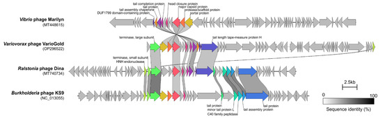 Decewicz, P.; Kitowicz, M.; Radlinska, M. Characteristics and Comparative Genomic Analysis of a Novel Virus, VarioGold, the First Bacteriophage of Variovorax. Int. J. Mol. Sci. 2022, 23, 13539. https://doi.org/10.3390/ijms232113539